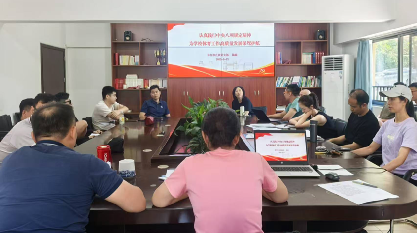 为坚持以习近平新时代中国特色社会主义思想为指引,深入学习贯彻习近平总书记关于加强党的作风建设的重要论述和中央八项规定精神,积极贯彻落实上级党委指示和学校党委要求, 2025年6月13日上午,体育部直属党支部全体党员同志在建虎游泳馆二楼会议室开展了六月主题党日活动。本次主题党日活动由张勇同志主持,杨焱同志讲党课,汪怡婷同志、肖月悦同志交流发言。