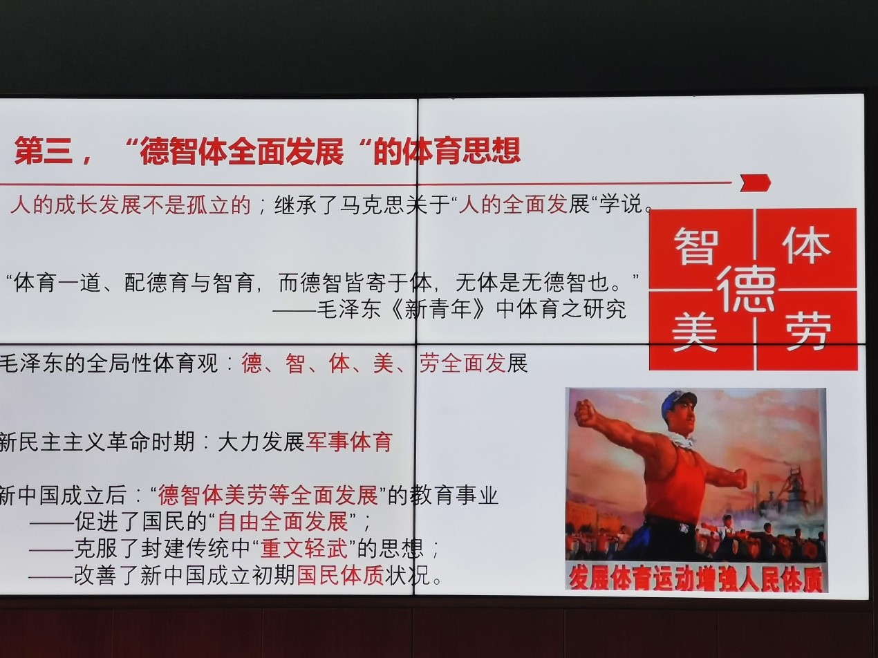 本次专题讲座荣幸邀请到我校马克思主义学院张蕴教授,她结合体育部的工作特点,精心准备,把党史中的体育元素挖掘出来,进行梳理,作了“历代中央领导集体关于体育重要论述及其对高校体育课程思政的启示”的党史学习教育专题讲座。