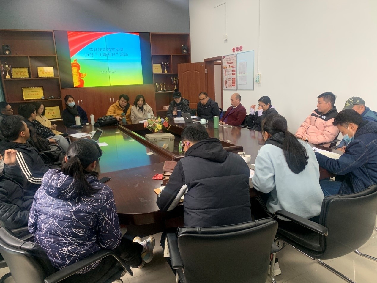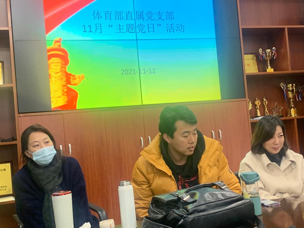 2021 年 11 月 12 日上午,体育部全体党员在会议室举行了 11 月“主题党日”活动。活动分为两个阶段:第一阶段是体育部副主任张勇同志讲党课;第二阶段是在学习习近平总书记“七一”重要讲话精神和相关文件后谈学习的心得体会交流发言。